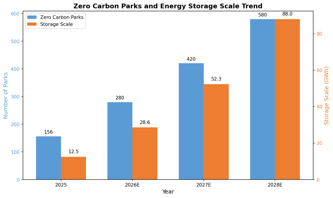- 2025年全国零碳园区数量156个,配套储能规模12.5 GWh